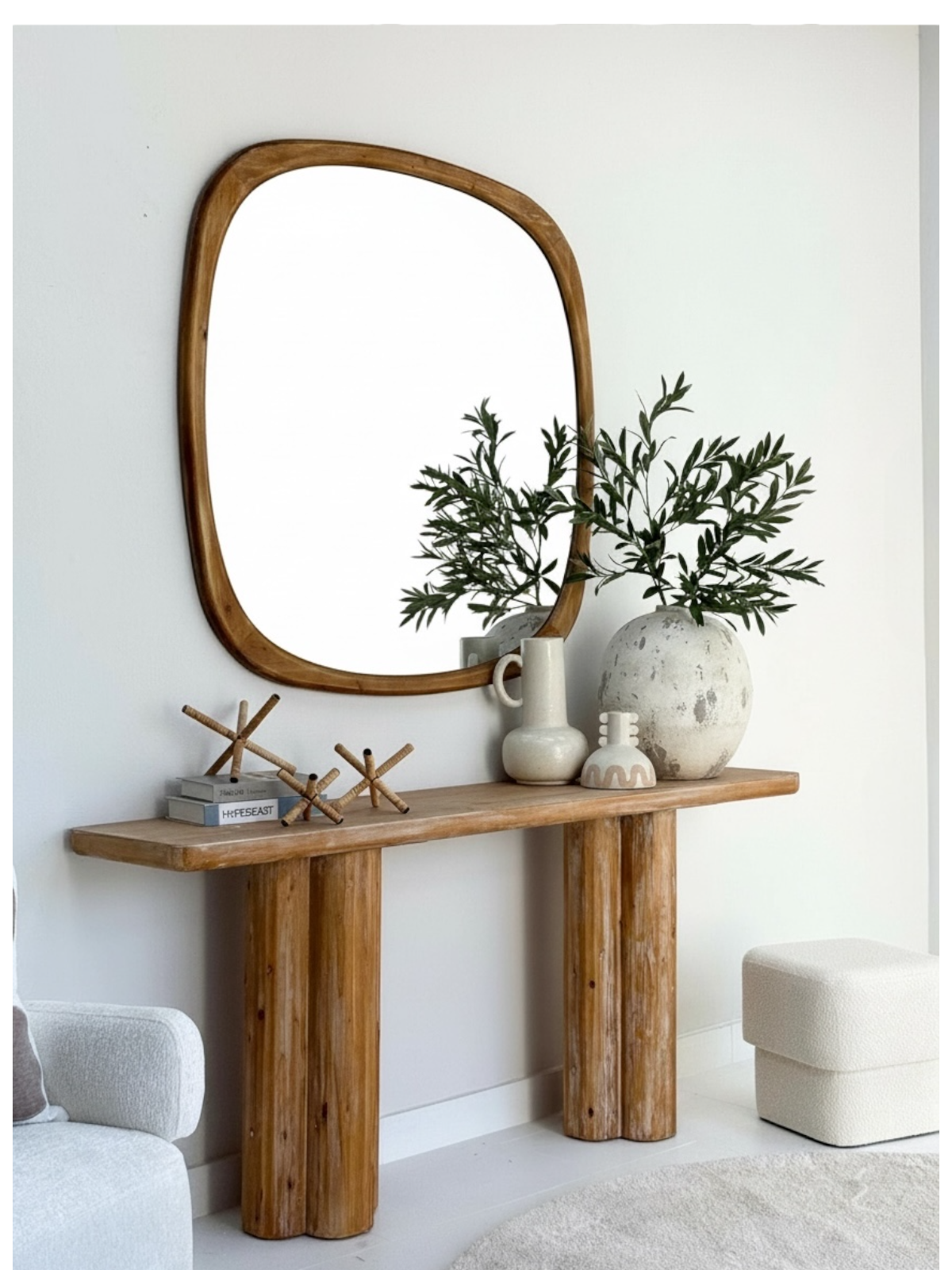 Make a statement with this stunning rounded corner wooden mirror. Crafted from natural wood with a bold, modern design, this oversized beauty commands attention in any room. The soft, rounded edges add contemporary elegance while the rich wood grain brings warmth and character to your space. Perfect for creating that majestic focal point you've been dreaming about—this isn't just a mirror, it's a showstopper that transforms your walls into a gallery-worthy display. Table Sold separately.