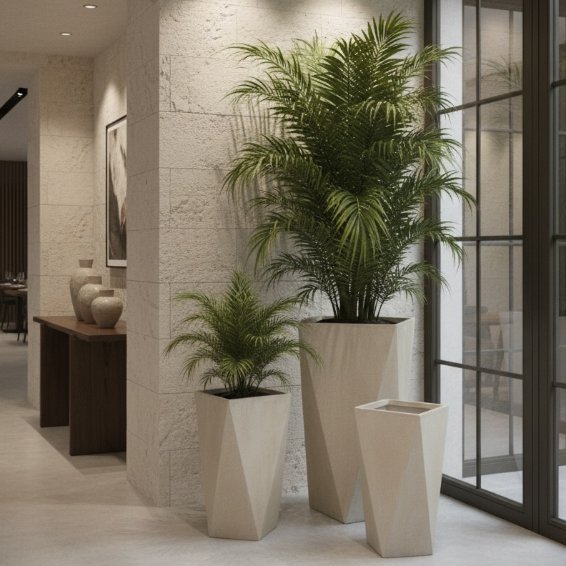 Elevate your space with this handcrafted geometric planter featuring a sophisticated beige stone finish. Built from durable fiber clay, it withstands intense heat and sun exposure without cracking, making it perfect for patios, gardens, or indoor displays. The integrated drainage system supports both natural and artificial plants. Its modern, minimalist design adds an instant contemporary touch to any décor scheme.