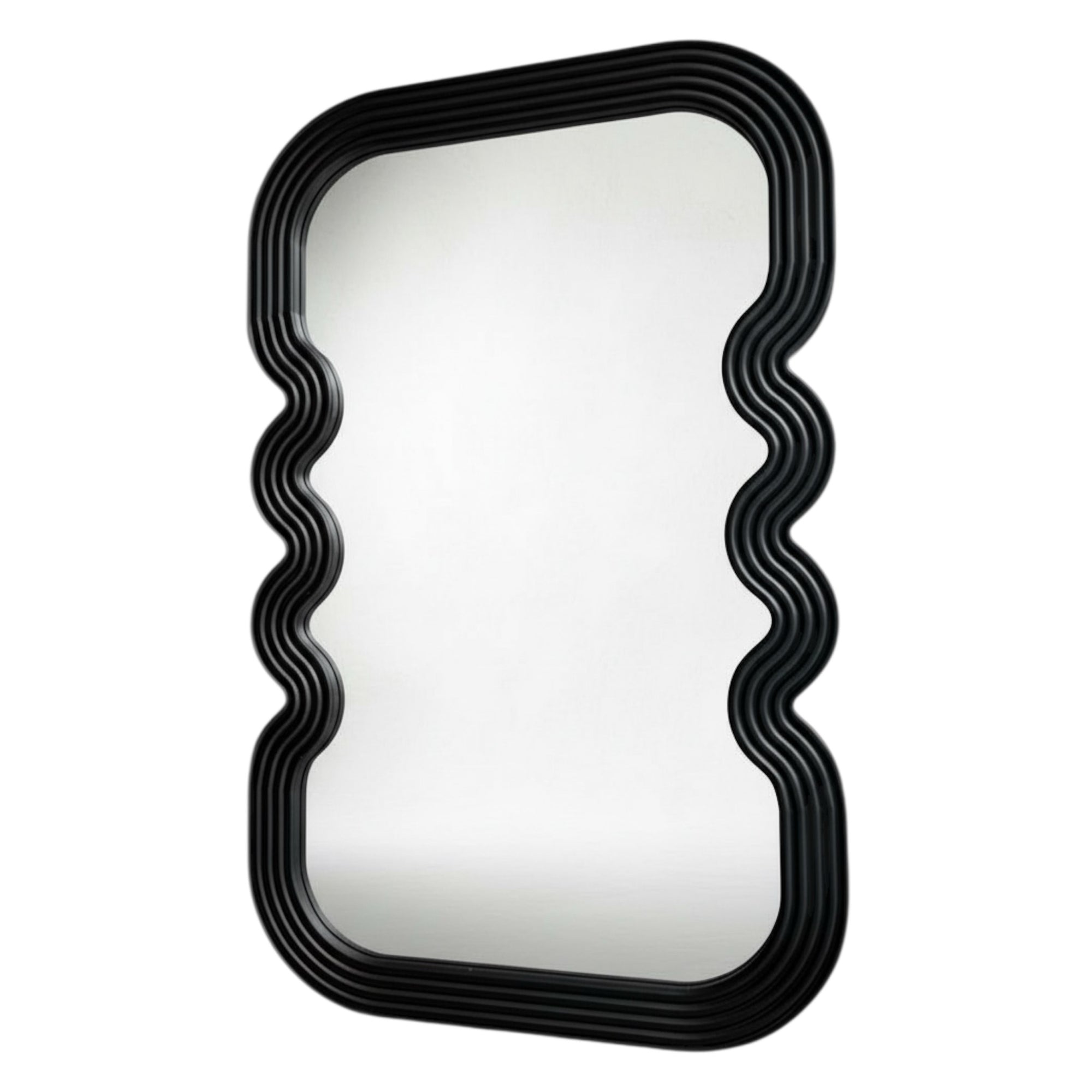 Make a statement with this stunning wavy shape wooden black mirror. This isn't just a mirror, it's a showstopper that transforms your walls into a modern and cozy. Table Sold separately.